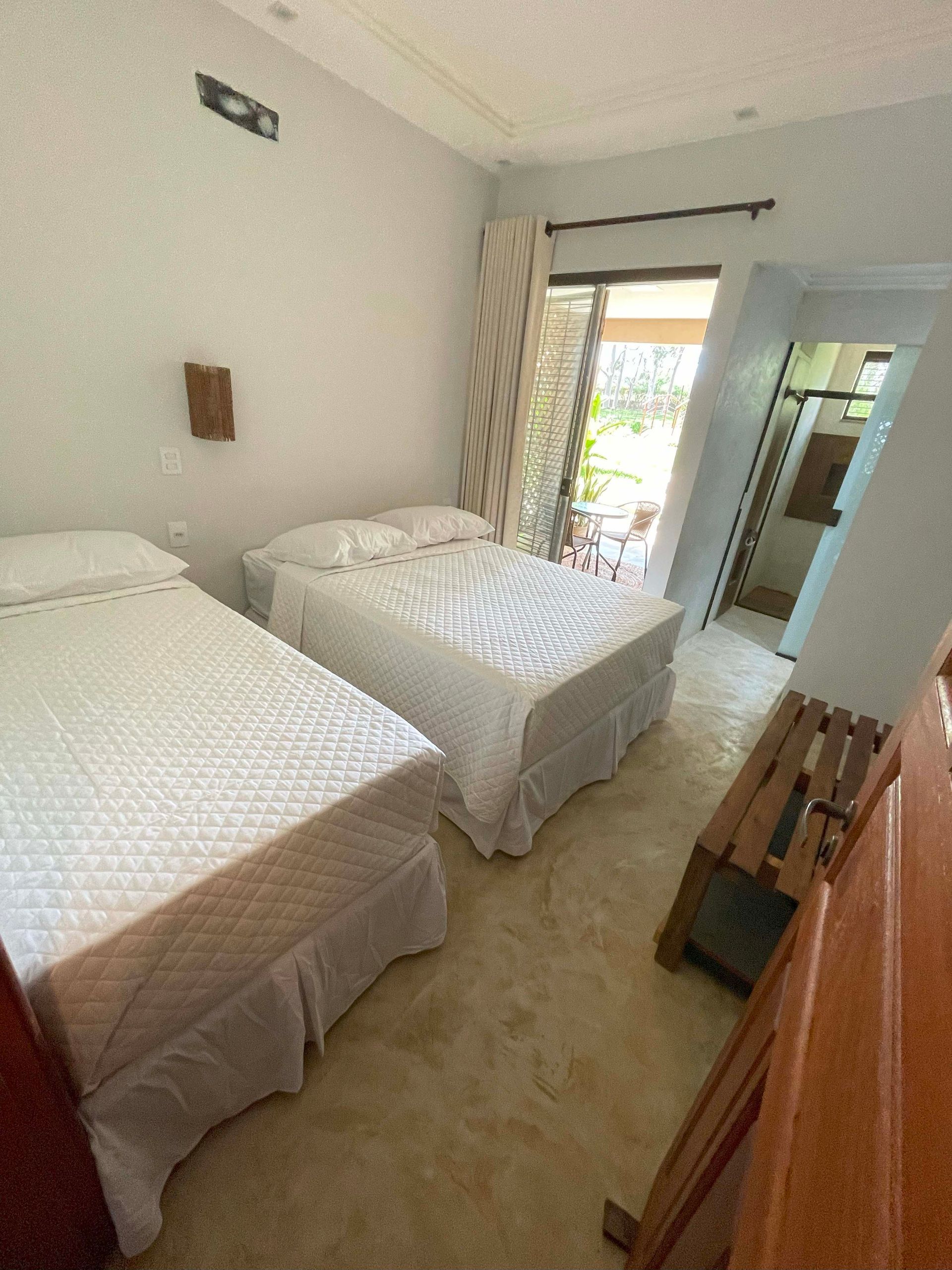 Quarto no piso superior com ar condicionado, blackout nas cortinas, 1 cama queen e 2 camas de solteiro, novas e confortáveis, guarnecidos com 2 mesas de cabeceiras, 2 cadeiras, 1 mesinha de centro, banheiro privativo, com pia de bancada e espelho, chuveiro quente, com vista privilegiada para o jardim, piscinas, montes e vales.