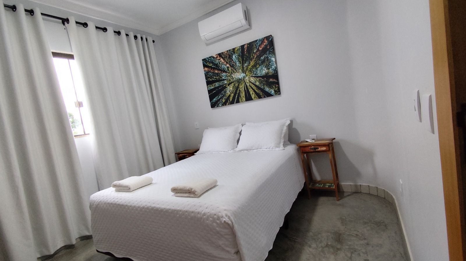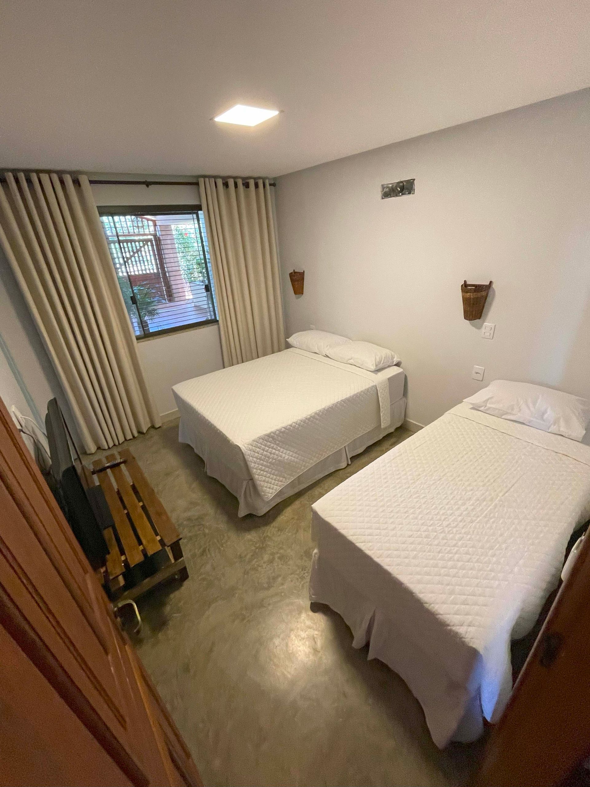 Quarto com ar condicionado, blackout nas cortinas, 1 cama de casal e 1 cama de solteiro, guarnecidas de 2 mesas de cabeceiras, com tv. Cama e colchões novos e confortáveis, suporte para malas e banheiro privativo com pia de bancada e chuveiro frio/quente.