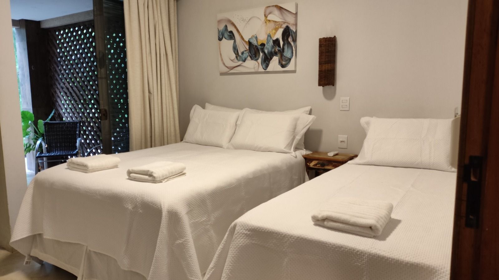 Quarto com ar condicionado, blackout nas cortinas, 1 cama de casal e 1 cama de solteiro novas e confortáveis, guarnecidas de 2 mesas de cabeceira, suporte para malas, banheiro privativo com pia de bancada e espelho privativo em relação ao box e sanitários e chuveiro quente/frio, varanda mobiliada e com rede, com vista para o lago ornamental de carpas e jardins, e com acesso a toda área aberta externa da pousada, jardins, piscinas, fogo de chão, etc.