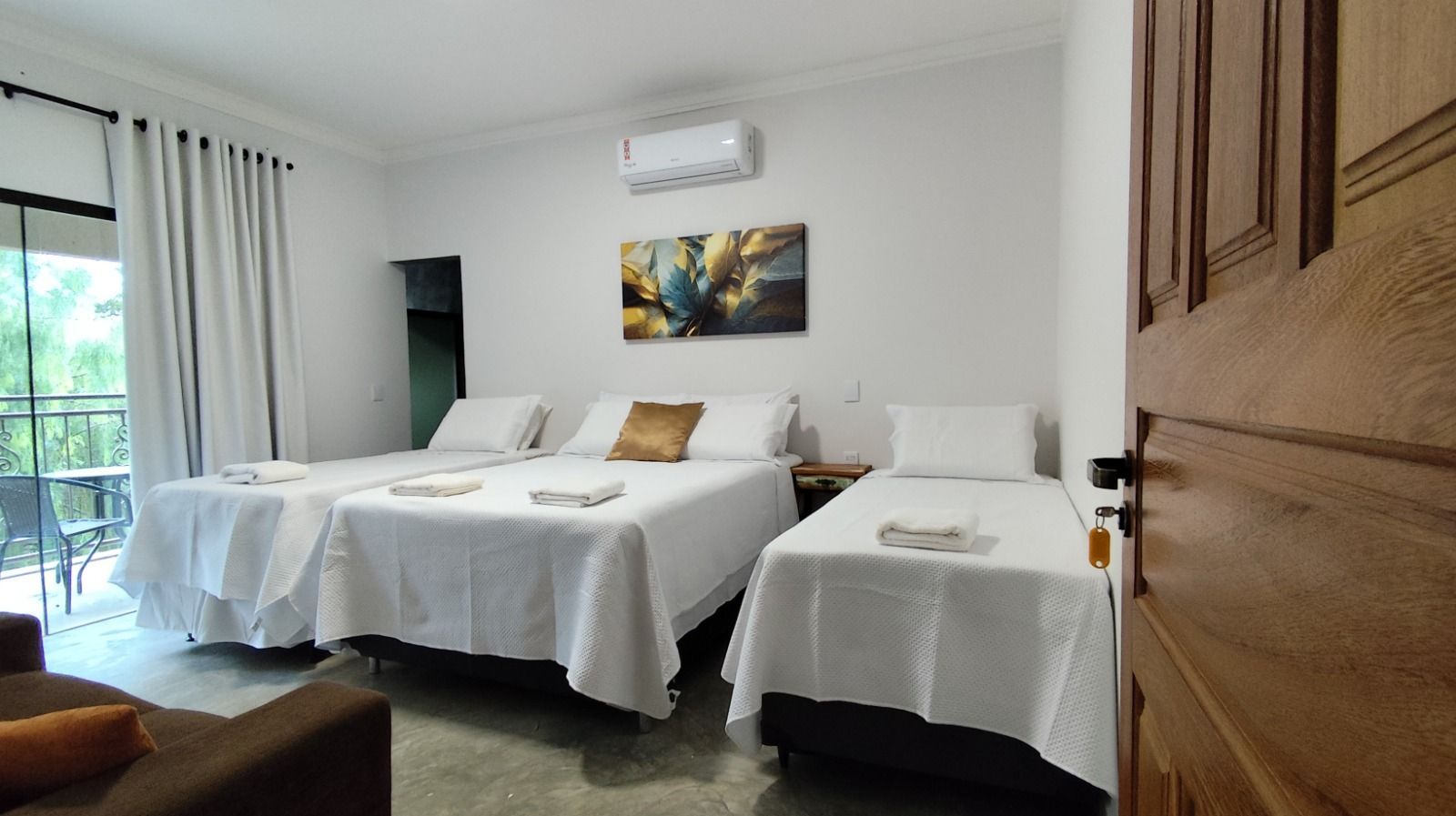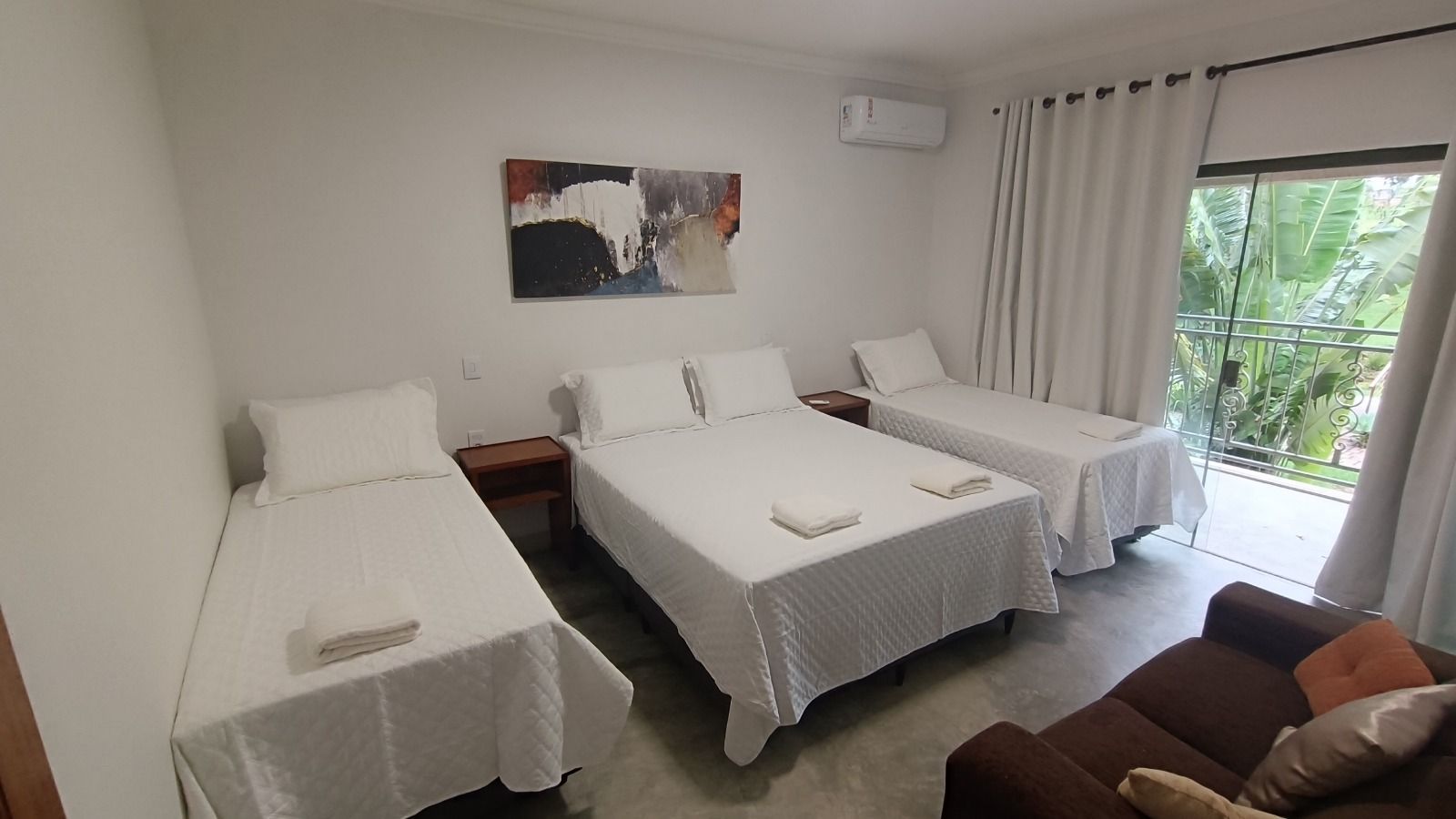 Quarto com ar condicionado, blackout nas cortinas, 1 cama de casal e 1 cama de solteiro novas e confortáveis, guarnecidas de 2 mesas de cabeceira, tv, suporte para malas, 1 poltrona, banheiro privativo adaptado com barras e chuveiro quente/frio, varanda mobiliada e com rede, com vista para o lago ornamental de carpas e jardins, e com acesso a toda área aberta externa da pousada, jardins, piscinas, fogo de chão, etc.